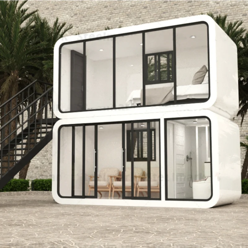 Просторная капсула с возможностью разделения на две функциональные зоны: спальню и гостиную. Внешняя отделка устойчива к перепадам температуры, что делает модель подходящей для круглогодичного использования.